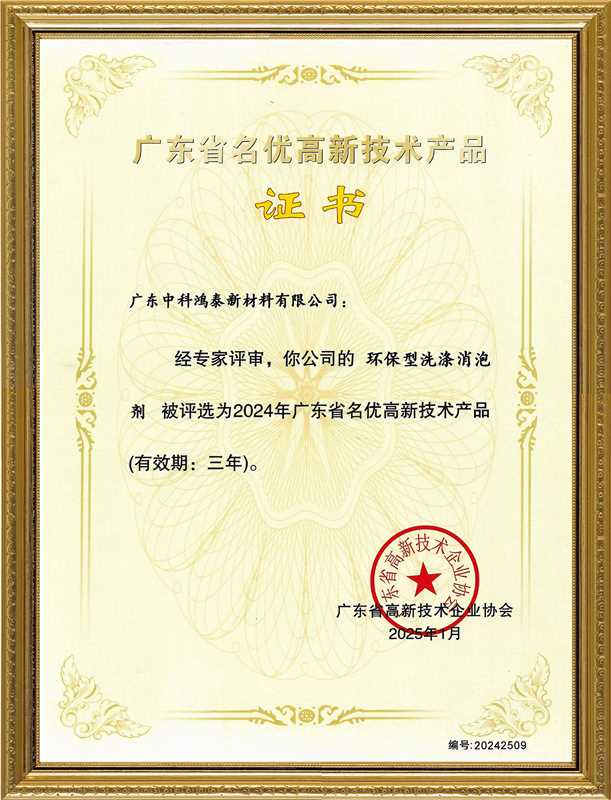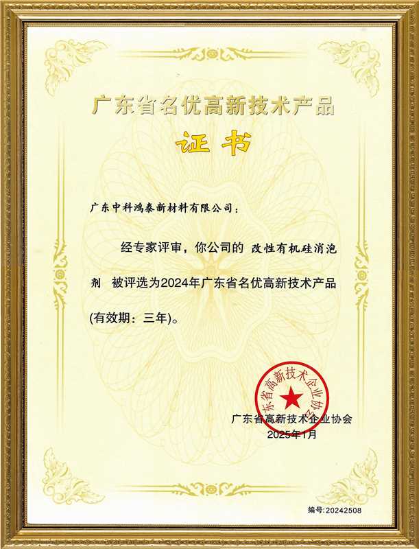 經(jīng)廣東省高新技術(shù)企業(yè)協(xié)會嚴(yán)格評審,廣東中科鴻泰新材料有限公司自主研發(fā)的“環(huán)保型洗滌消泡劑”與“改性有機硅消泡劑”兩款核心產(chǎn)品,成功榮獲“廣東省名優(yōu)高新技術(shù)產(chǎn)品”證書。這一權(quán)威認(rèn)證,標(biāo)志著中科鴻泰在消泡劑領(lǐng)域的技術(shù)創(chuàng)新實力、產(chǎn)品質(zhì)量水平及市場競爭力獲得了省級層面的高度認(rèn)可。
